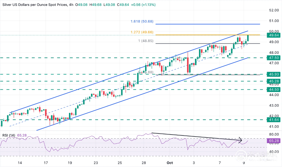 白银维持上行趋势,过去三周涨幅已超20%,技术面呈现超买迹象。然而基本面支撑依然稳固,除4小时图RSI顶背离外,未见任何回调信号。