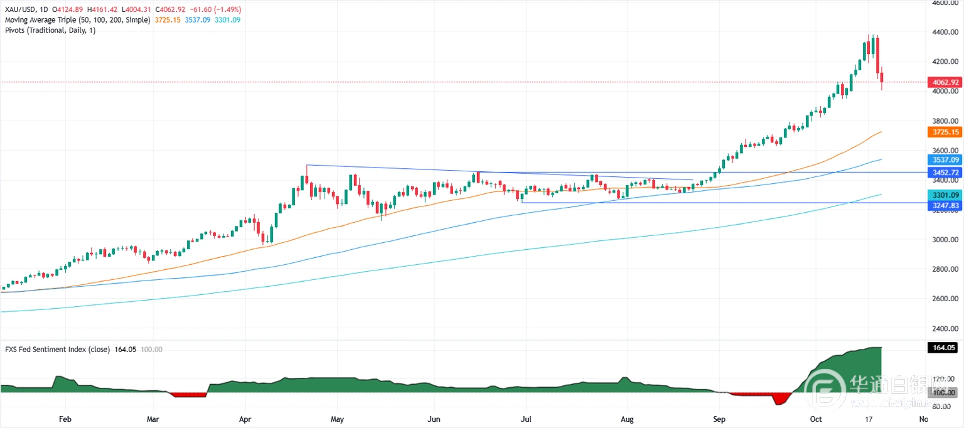尽管美元指数显示美元小幅下跌0.13%至98.84,但金价仍然承压,交易商将黄金现货价格推低至10月8日创下的4059美元/盎司的历史高点下方。