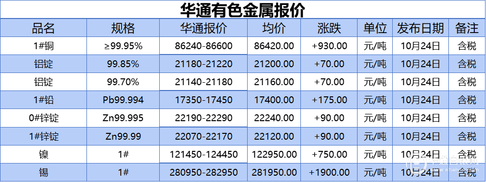 华通白银网 10月24日讯:1#铜、铝锭(99.85%)、铝锭(99.70%)、1#铅、1#锌、0#锌、镍、锡报价