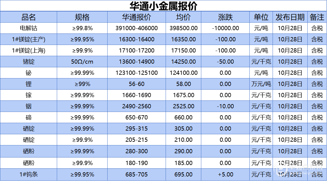 华通白银网 10月28日讯:电解钴、1#镁锭(生产)、1#镁锭(上海)、锗锭、铋、锂、镓、铟、碲、硒锭(99.99%)、硒锭(99.9%)、硒粉、硒粉(99.9%)、1#钨条报价