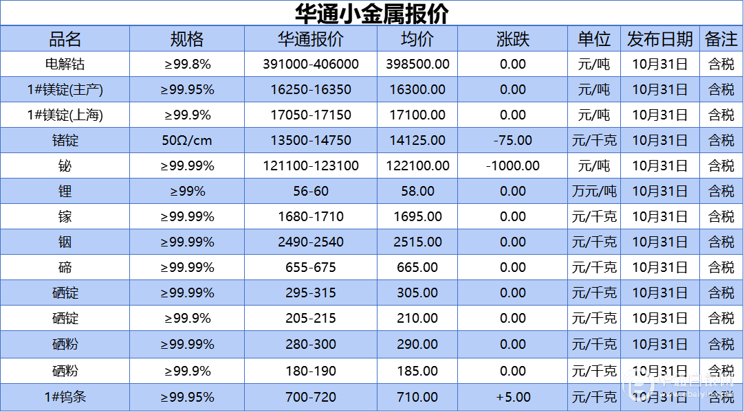 华通白银网 10月31日讯:电解钴、1#镁锭(生产)、1#镁锭(上海)、锗锭、铋、锂、镓、铟、碲、硒锭(99.99%)、硒锭(99.9%)、硒粉、硒粉(99.9%)、1#钨条报价
