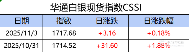 华通白银现货指数CSSI走势日报,今日指数1717.68,日涨跌+3.16,日涨跌幅+0.18%