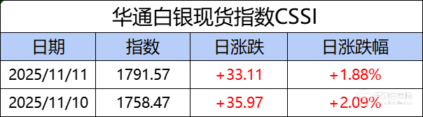 华通白银现货指数CSSI走势日报,今日指数1791.57,日涨跌+33.11,日涨跌幅+1.88%