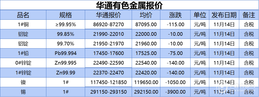 华通白银网 11月14日讯:1#铜、铝锭(99.85%)、铝锭(99.70%)、1#铅、1#锌、0#锌、镍、锡报价