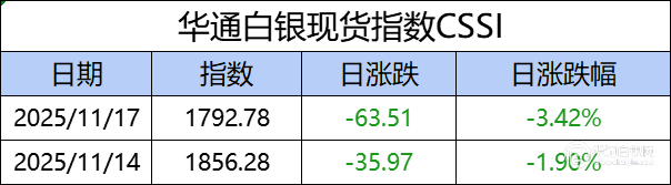 华通白银现货指数CSSI走势日报,今日指数1792.78,日涨跌-63.51,日涨跌幅-3.42%