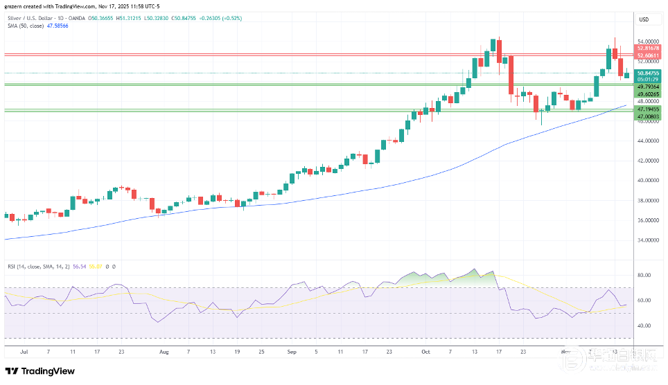随着金银比下降至80.00,白银价格回落至50.50美元上方。