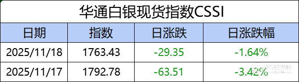 华通白银现货指数CSSI走势日报,今日指数1763.43,日涨跌-29.35,日涨跌幅-1.64%