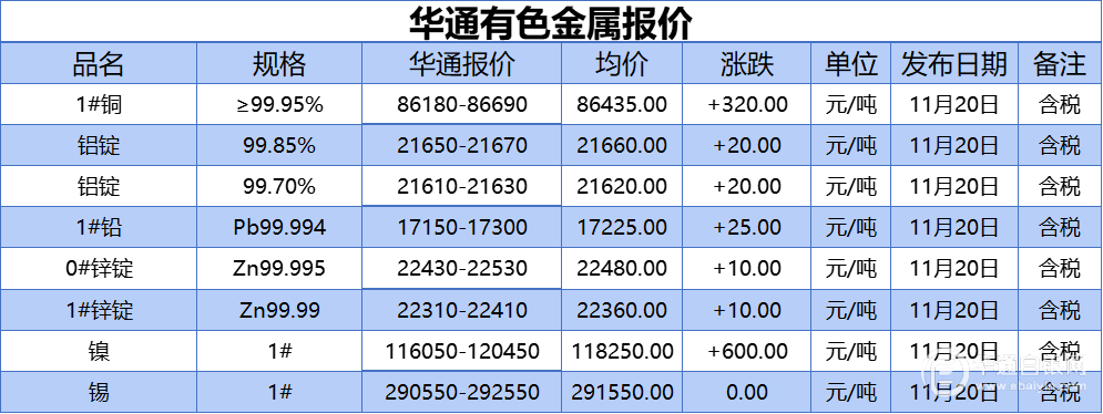 华通白银网 11月20日讯:1#铜、铝锭(99.85%)、铝锭(99.70%)、1#铅、1#锌、0#锌、镍、锡报价