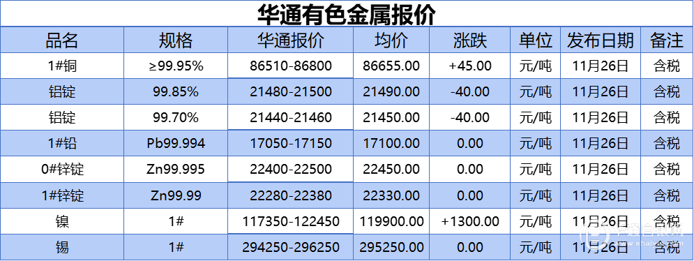 华通白银网 11月26日讯:1#铜、铝锭(99.85%)、铝锭(99.70%)、1#铅、1#锌、0#锌、镍、锡报价