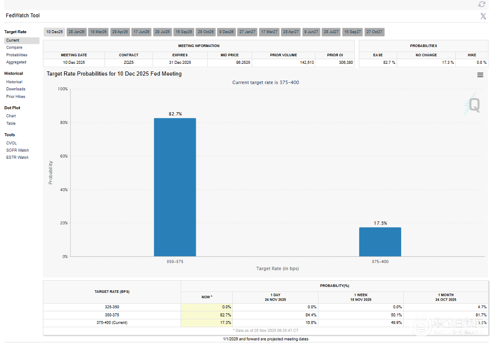 联邦基金期货目前反映出美联储降息25个基点的可能性约为83%。