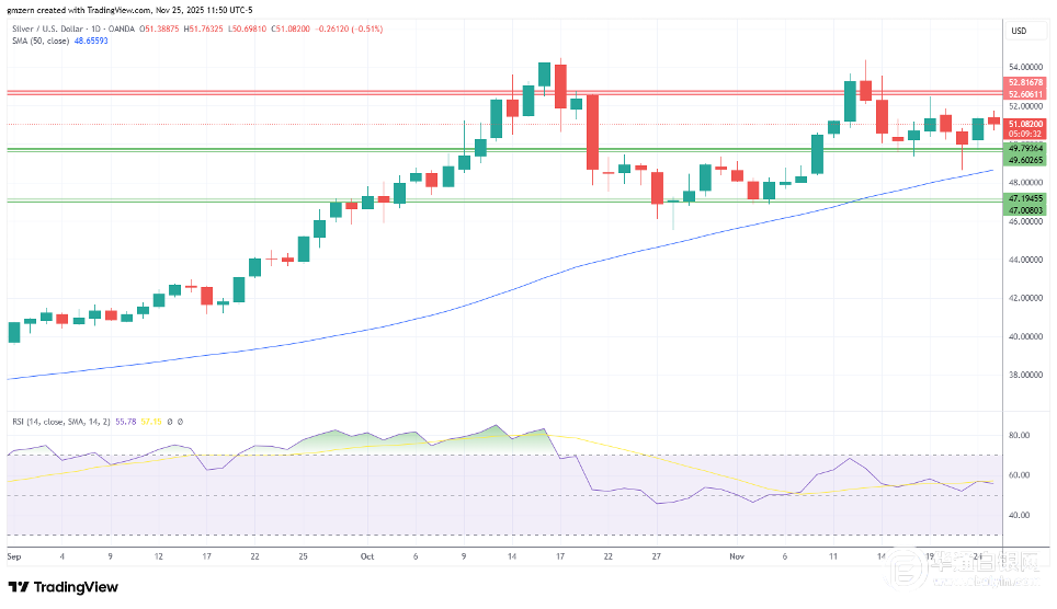 如果银价跌破51.00美元,则将向最近的支撑位49.60-49.80美元区间前进。