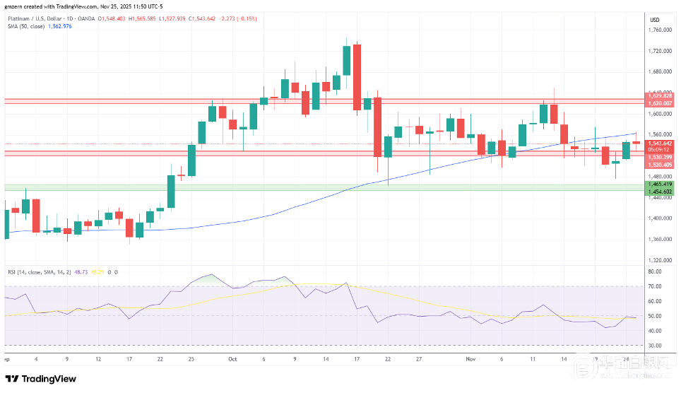 铂金测试了50均线1562美元,但未能形成足够的上行动能。