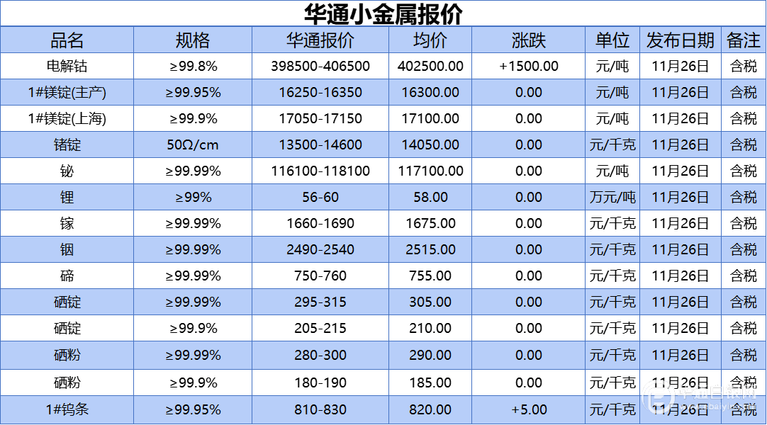 华通白银网 11月26日讯:电解钴、1#镁锭(生产)、1#镁锭(上海)、锗锭、铋、锂、镓、铟、碲、硒锭(99.99%)、硒锭(99.9%)、硒粉、硒粉(99.9%)、1#钨条报价