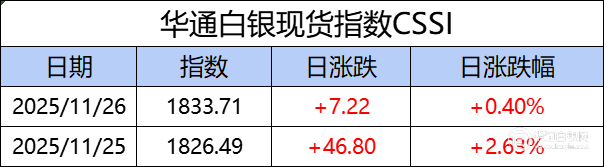 华通白银现货指数CSSI走势日报,今日指数1833.71,日涨跌+7.22,日涨跌幅+0.40%