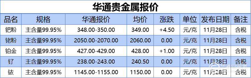 华通白银网 11月28日讯:钯粉、铑粉、铂金、钌、铱报价