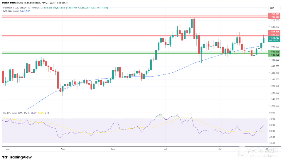 随着强劲涨势持续,铂金创下新高。目前,铂金试图收于阻力位1620-1630美元上方。