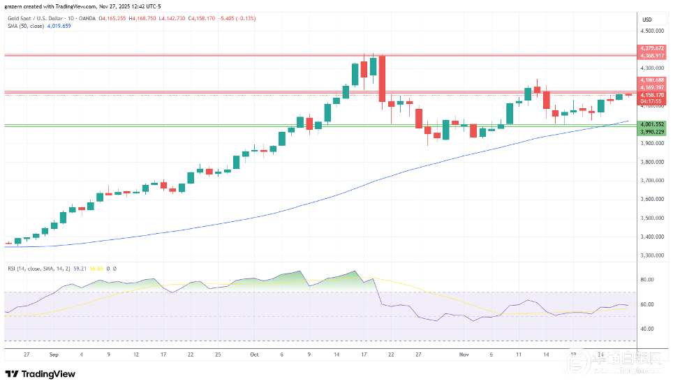 【华通白银网11月28日讯】•金价未能收于每盎司4180美元上方。