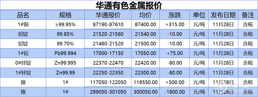 华通白银网 11月28日讯:1#铜、铝锭(99.85%)、铝锭(99.70%)、1#铅、1#锌、0#锌、镍、锡报价