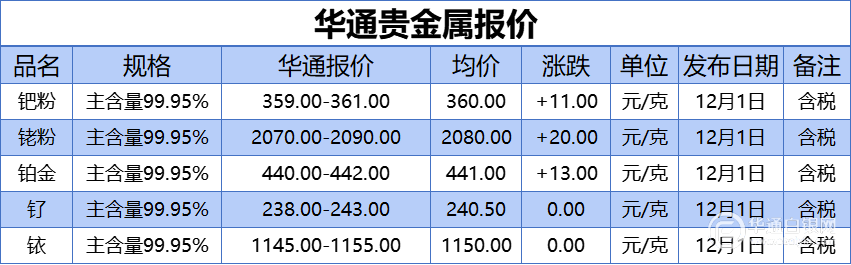 华通白银网 12月1日讯:钯粉、铑粉、铂金、钌、铱报价