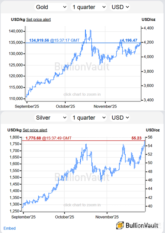 (过去3个月以美元计算的黄金和白银价格走势图)