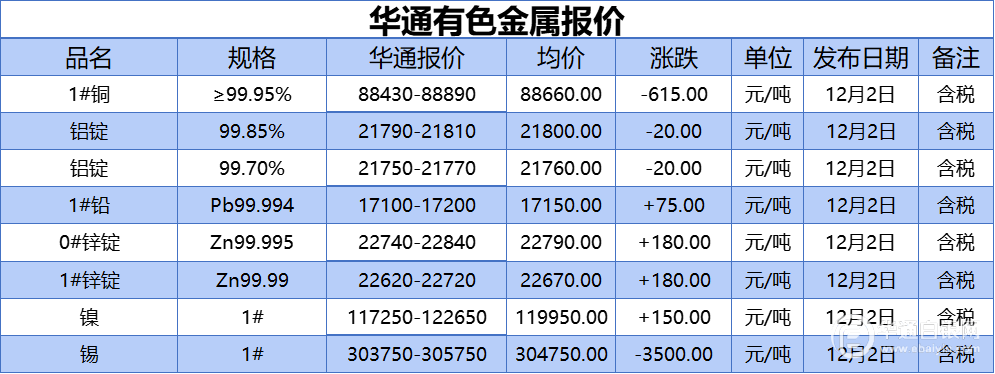 华通白银网 12月2日讯:1#铜、铝锭(99.85%)、铝锭(99.70%)、1#铅、1#锌、0#锌、镍、锡报价