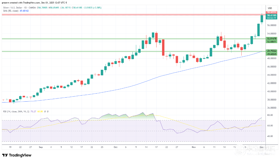 •白银突破58.00美元。