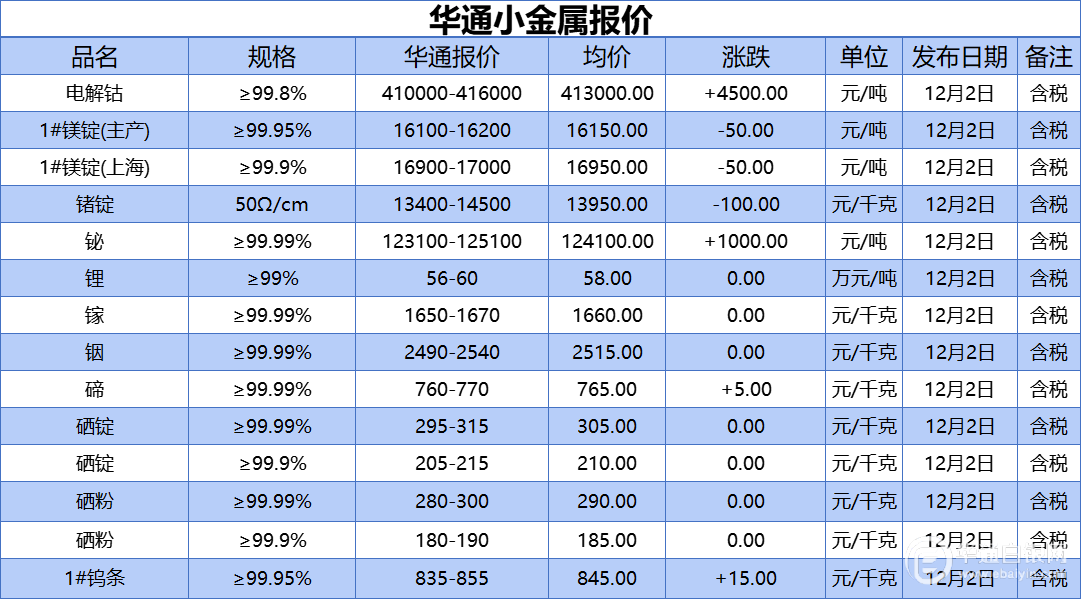 华通白银网 12月2日讯:电解钴、1#镁锭(生产)、1#镁锭(上海)、锗锭、铋、锂、镓、铟、碲、硒锭(99.99%)、硒锭(99.9%)、硒粉、硒粉(99.9%)、1#钨条报价