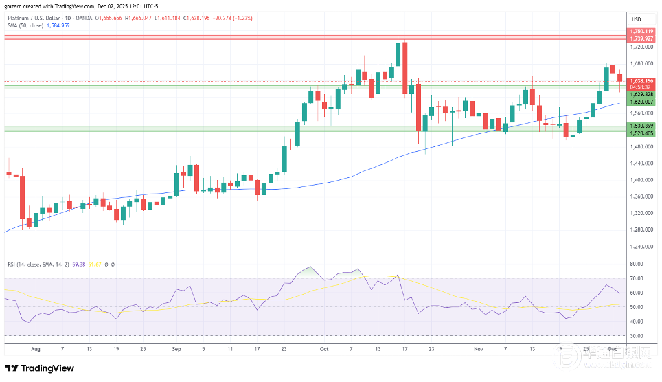 在贵金属市场普遍回落之际,铂金试图收于1620-1630美元的支撑位下方。