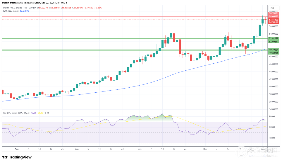 银价最近再次尝试收于58.60-58.80美元阻力位上方,但失去了动力并回落。