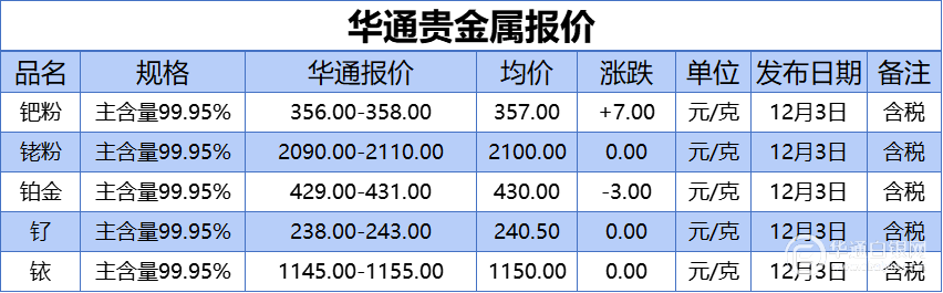华通白银网 12月3日讯:钯粉、铑粉、铂金、钌、铱报价