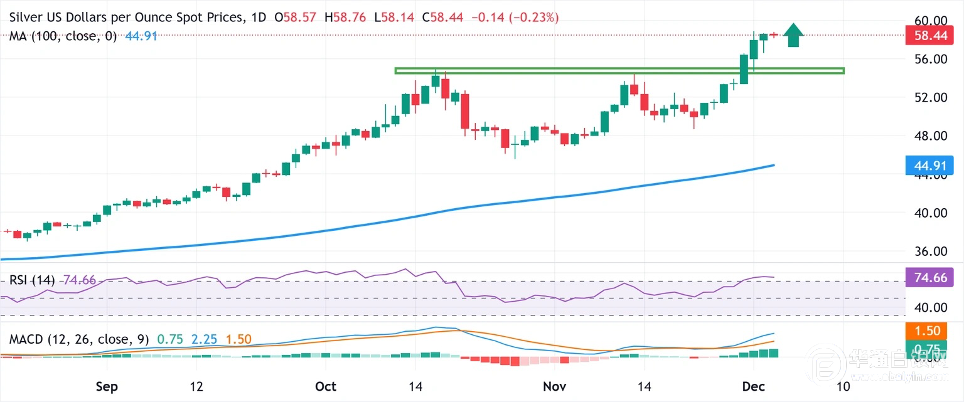 【华通白银网12月03日讯】•白银在区间内震荡,隔夜日线相对强弱指标(RSI)显示多头正稍作喘息。