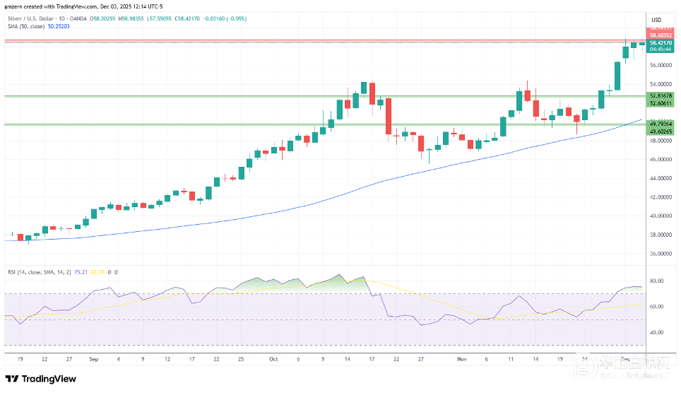 银价继续尝试稳定在最近的阻力位58.60-58.80美元上方。