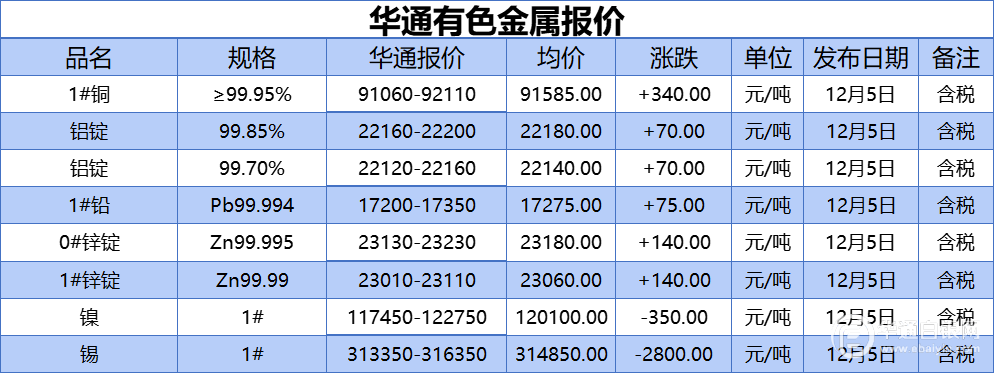 华通白银网 12月5日讯:1#铜、铝锭(99.85%)、铝锭(99.70%)、1#铅、1#锌、0#锌、镍、锡报价