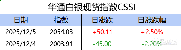 华通白银现货指数CSSI走势日报,今日指数2054.03,日涨跌+50.11,日涨跌幅+2.50%