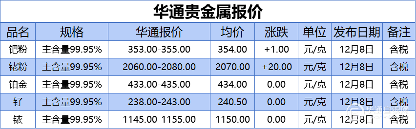 华通白银网 12月8日讯:钯粉、铑粉、铂金、钌、铱报价