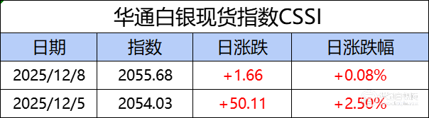 华通白银现货指数CSSI走势日报,今日指数2055.68,日涨跌+1.66,日涨跌幅+0.08%