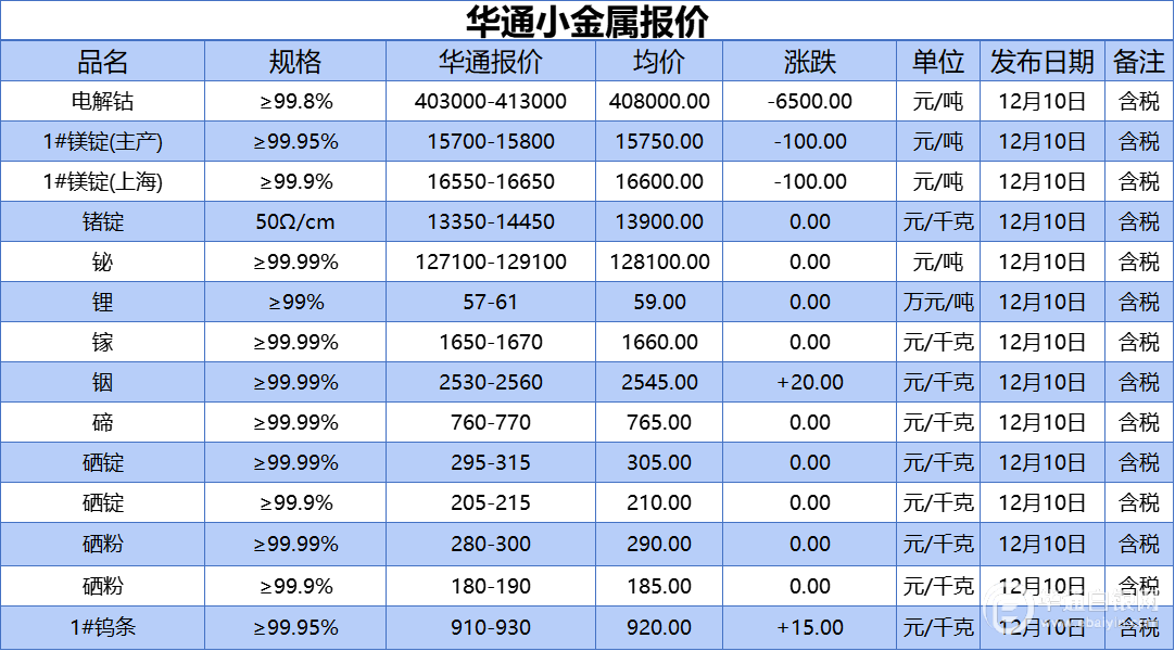 华通白银网 12月10日讯:电解、1#镁锭(生产)、1#镁锭(上海)、锗锭、铋、锂、镓、铟、碲、硒锭(99.99%)、硒锭(99.9%)、硒粉、硒粉(99.9%)、1#钨条报价