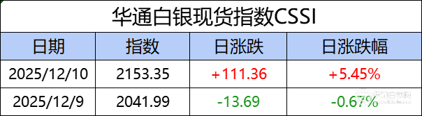 华通白银现货指数CSSI走势日报,今日指数2153.35,日涨跌+111.36,日涨跌幅+5.45%