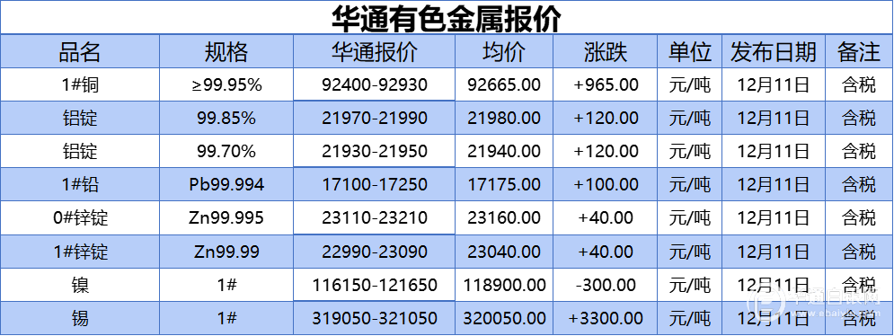 华通白银网 12月11日讯:1#铜、铝锭(99.85%)、铝锭(99.70%)、1#铅、1#锌、0#锌、镍、锡报价