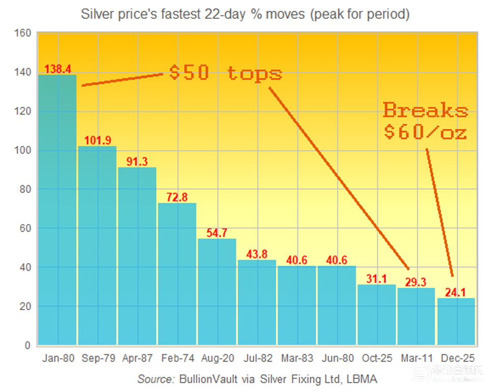 即便如此,在1968年以来的所有1个月涨幅中,今天的22日银价涨幅仍处于前2.5%之列。