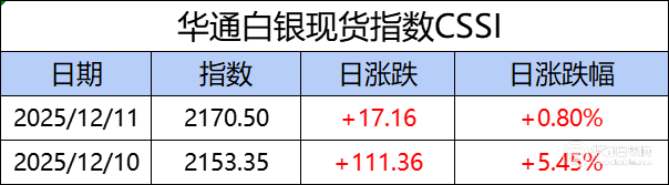 华通白银现货指数CSSI走势日报,今日指数2170.50,日涨跌+17.16,日涨跌幅+0.80%