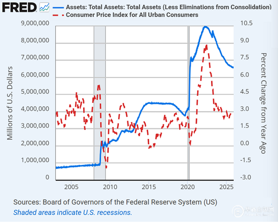 (美联储资产负债表总资产与美国CPI年通胀率的对比图)