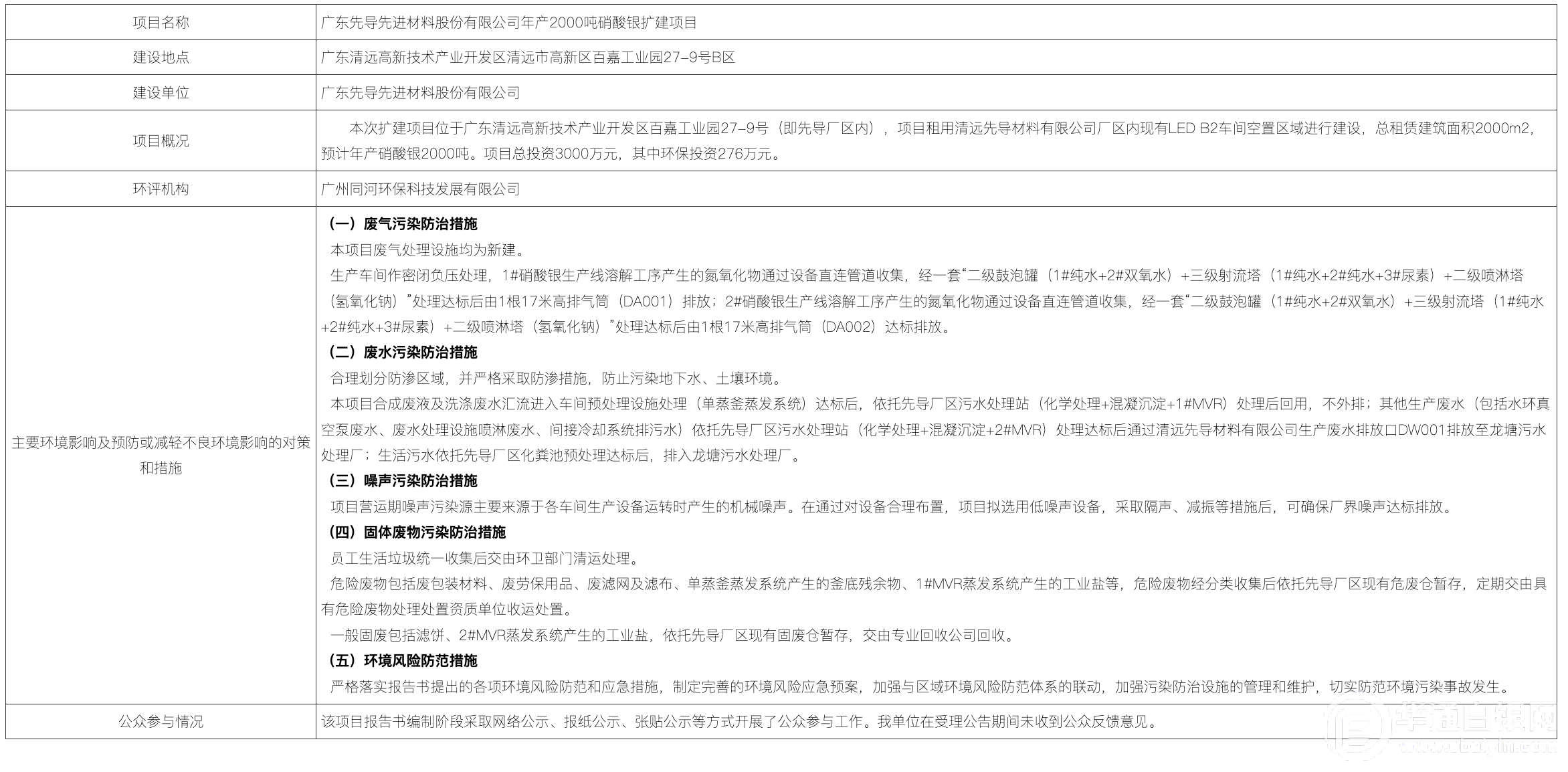 根据广东先导先进材料股份有限公司年产2000吨硝酸银扩建项目环境影响评价文件、技术评估报告等,按照建设项目环境影响评价审批程序的有关规定,我局拟对该项目环境影响评价文件作出批准决定。为体现公开、公正的原则,强化公众参与,现予公示,公示期5个工作日(2025年12月11日至2025年12月17日)。如有意见,请在公示期内来信或来电向我局反映。