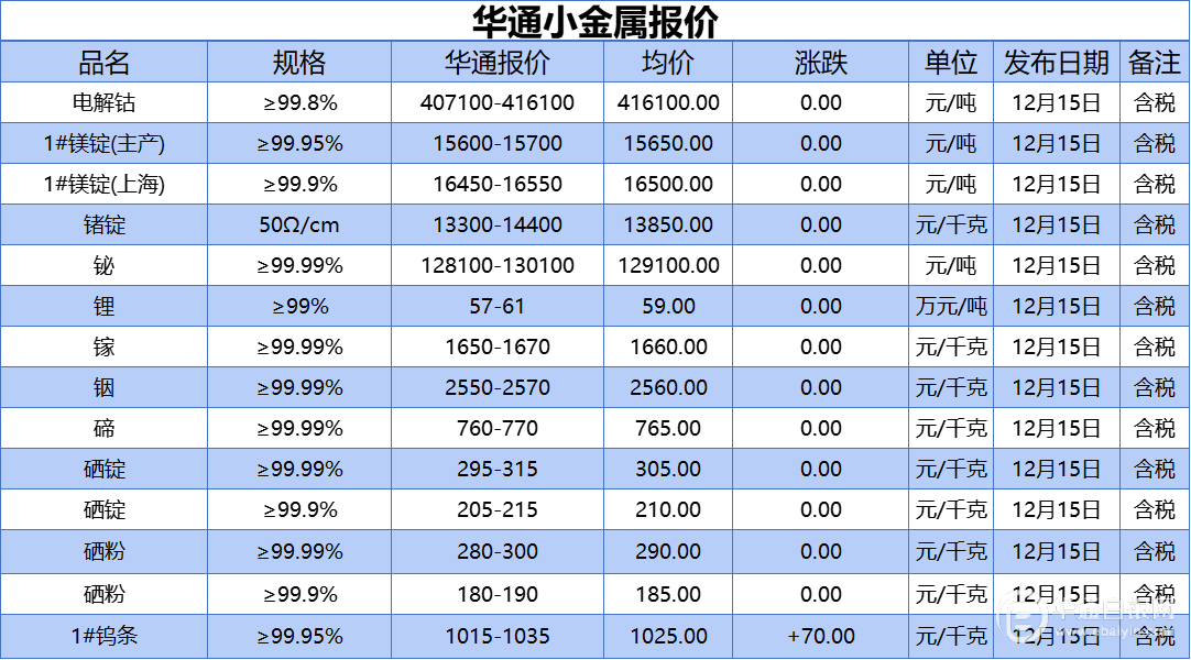 华通白银网 12月15日讯:电解钴、1#镁锭(生产)、1#镁锭(上海)、锗锭、铋、锂、镓、铟、碲、硒锭(99.99%)、硒锭(99.9%)、硒粉、硒粉(99.9%)、1#钨条报价
