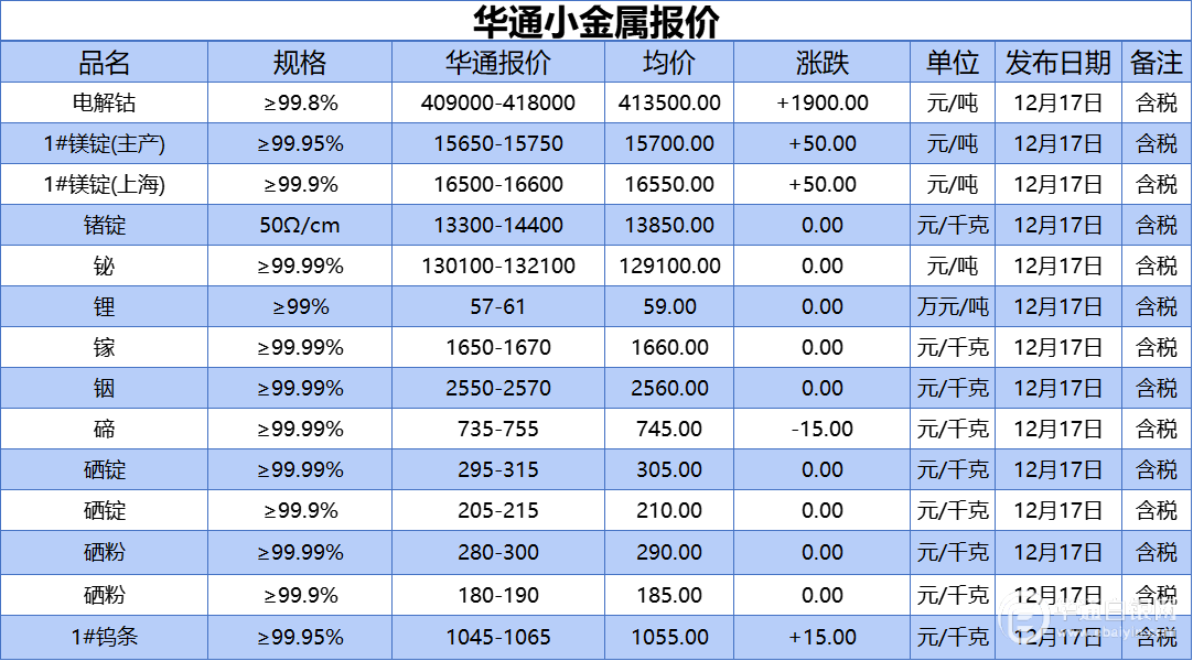 华通白银网 12月17日讯:电解钴、1#镁锭(生产)、1#镁锭(上海)、锗锭、铋、锂、镓、铟、碲、硒锭(99.99%)、硒锭(99.9%)、硒粉、硒粉(99.9%)、1#钨条报价