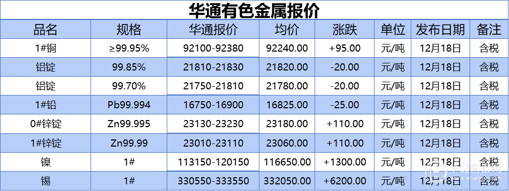 华通白银网 12月18日讯:1#铜、铝锭(99.85%)、铝锭(99.70%)、1#铅、1#锌、0#锌、镍、锡报价