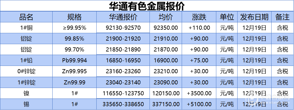 华通白银网 12月19日讯:1#铜、铝锭(99.85%)、铝锭(99.70%)、1#铅、1#锌、0#锌、镍、锡报价