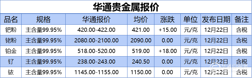 华通白银网 12月22日讯:钯粉、铑粉、铂金、钌、铱报价