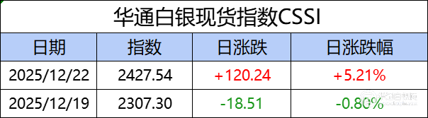 华通白银现货指数CSSI走势日报,今日指数2427.54,日涨跌+120.24,日涨跌幅+5.21%