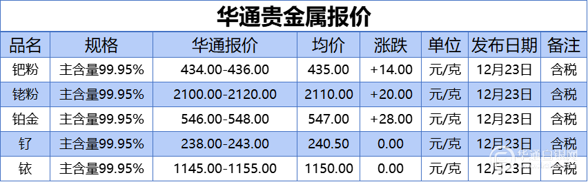 华通白银网 12月23日讯:钯粉、铑粉、铂金、钌、铱报价